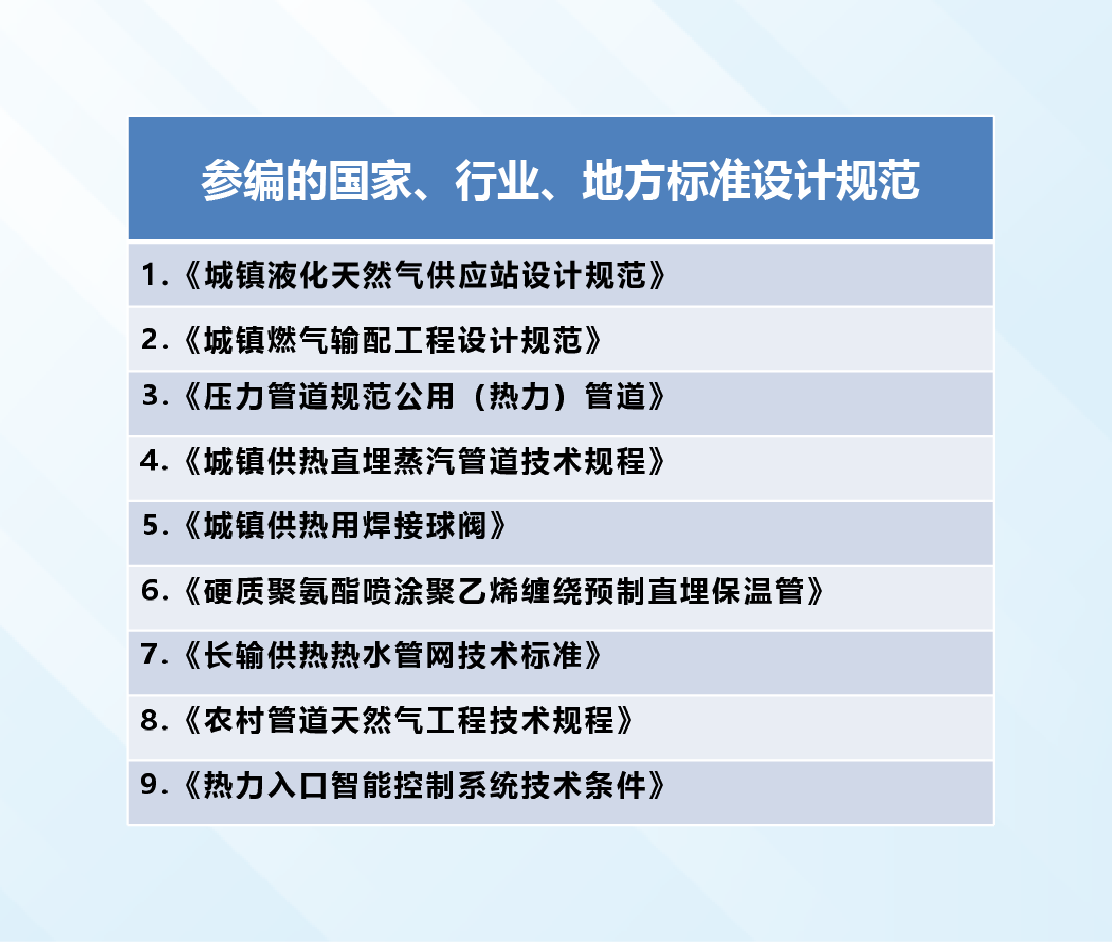 我公司參與編制了國家標準《城鎮(zhèn)液化天然氣供應站設計規(guī)范》、《城鎮(zhèn)燃氣輸配工程設計規(guī)范》、《壓力管道規(guī)范 公用管道(熱力)》、《城鎮(zhèn)供熱直埋蒸汽管道技術(shù)規(guī)程》、《城鎮(zhèn)供熱用焊接球閥》、《硬質(zhì)聚氨酯噴涂聚乙烯纏繞預制直埋保溫管》工作。其中為《壓力管道規(guī)范 公用管道(熱力)》編制起到主要作用。